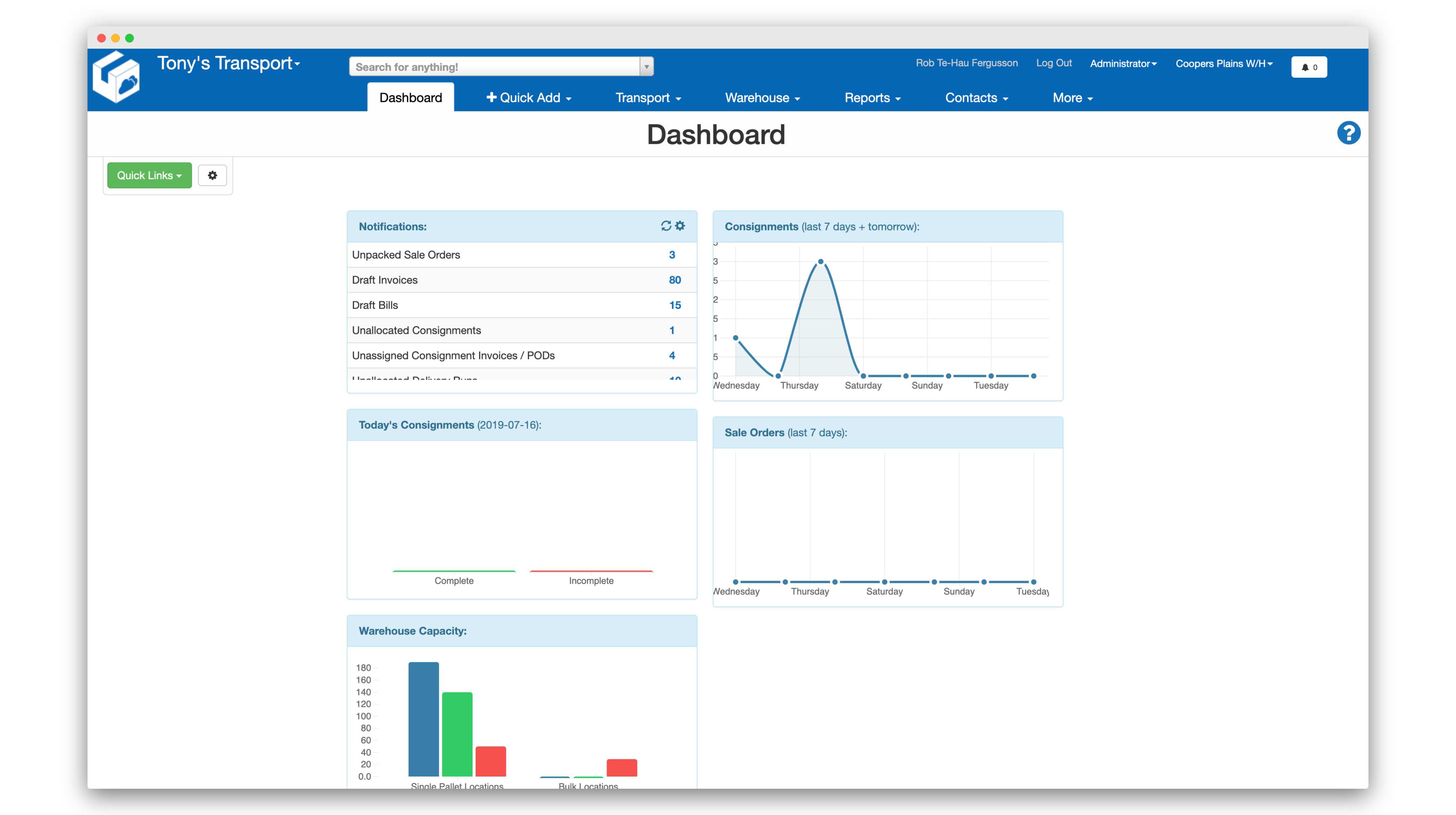The dashboard in CartonCloud provides you with an overview of what's currently happening, and any action items that you need to take care of within either the warehouse management system or the transport management system. You can see from this dashboard the daily consignment volumes over the last week, as well as the volume of sales orders. In addition, in the top left, we provide you with a list of anything that we believe is important enough that you should go and action right away.