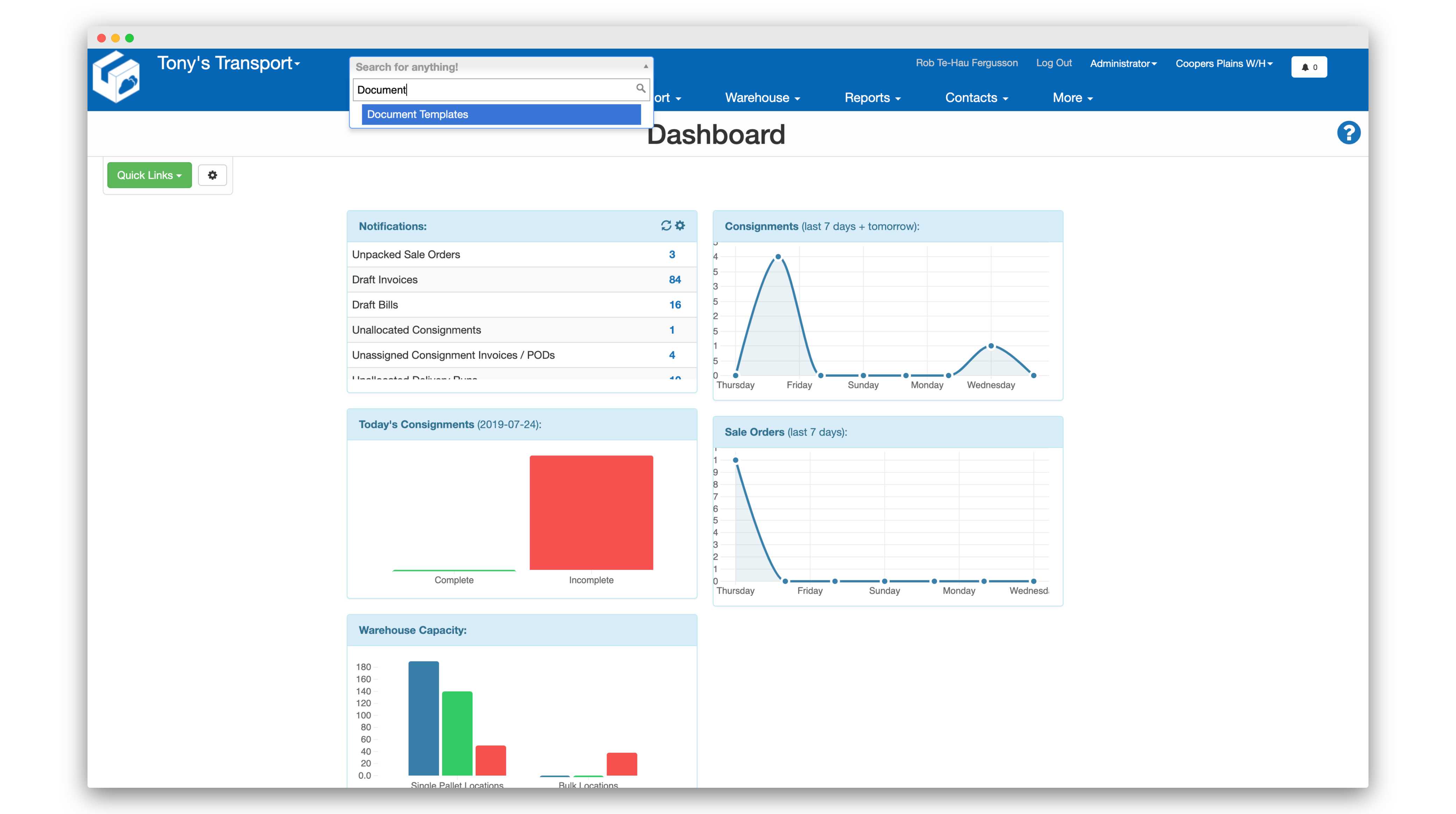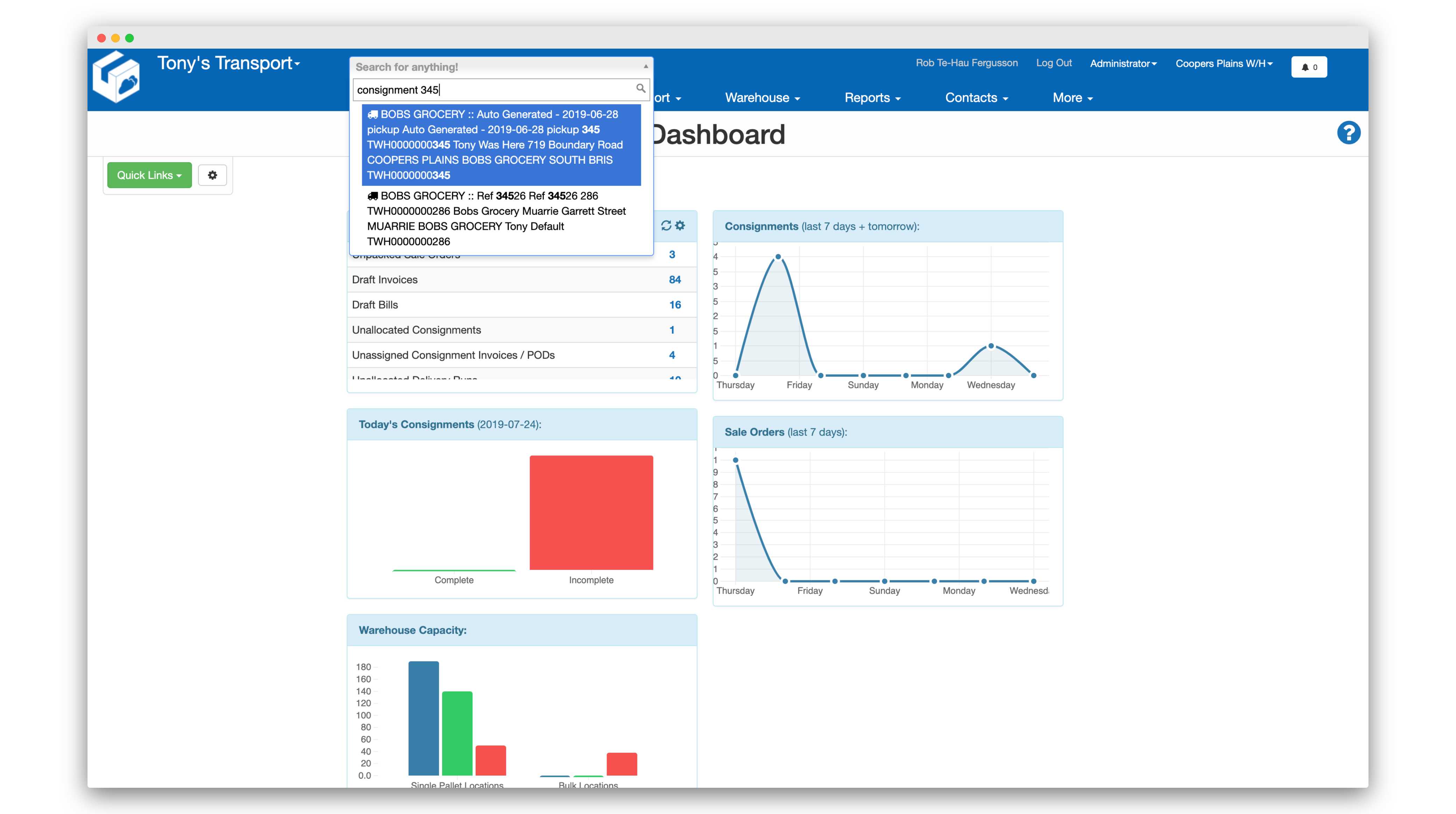 So one thing we put a lot of effort into within CartonCloud is making searching really easy and really fast. We have a field at the top of the application which just says, "Search for anything!" Within that search field you can look for consignments, sales orders, purchase orders, products, warehouse locations, users, run sheets, invoices. You can literally search for anything up in there, and jump straight to that record.