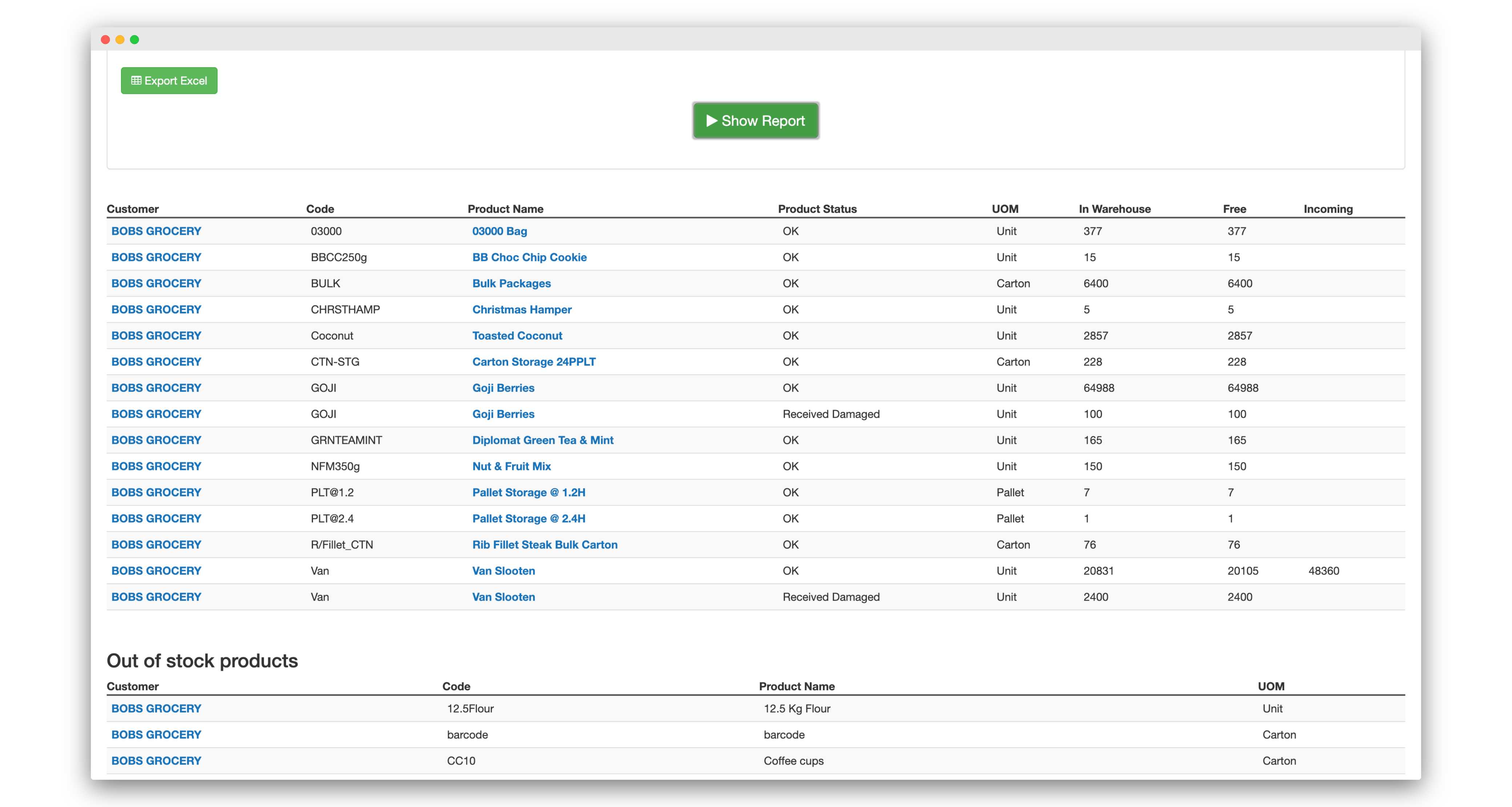 Within our warehouse management system we allow you to run reports which provide you with the status of stocked items in the warehouse. So if you just want to see all damaged stock which is in the warehouse, you can run the report for that.