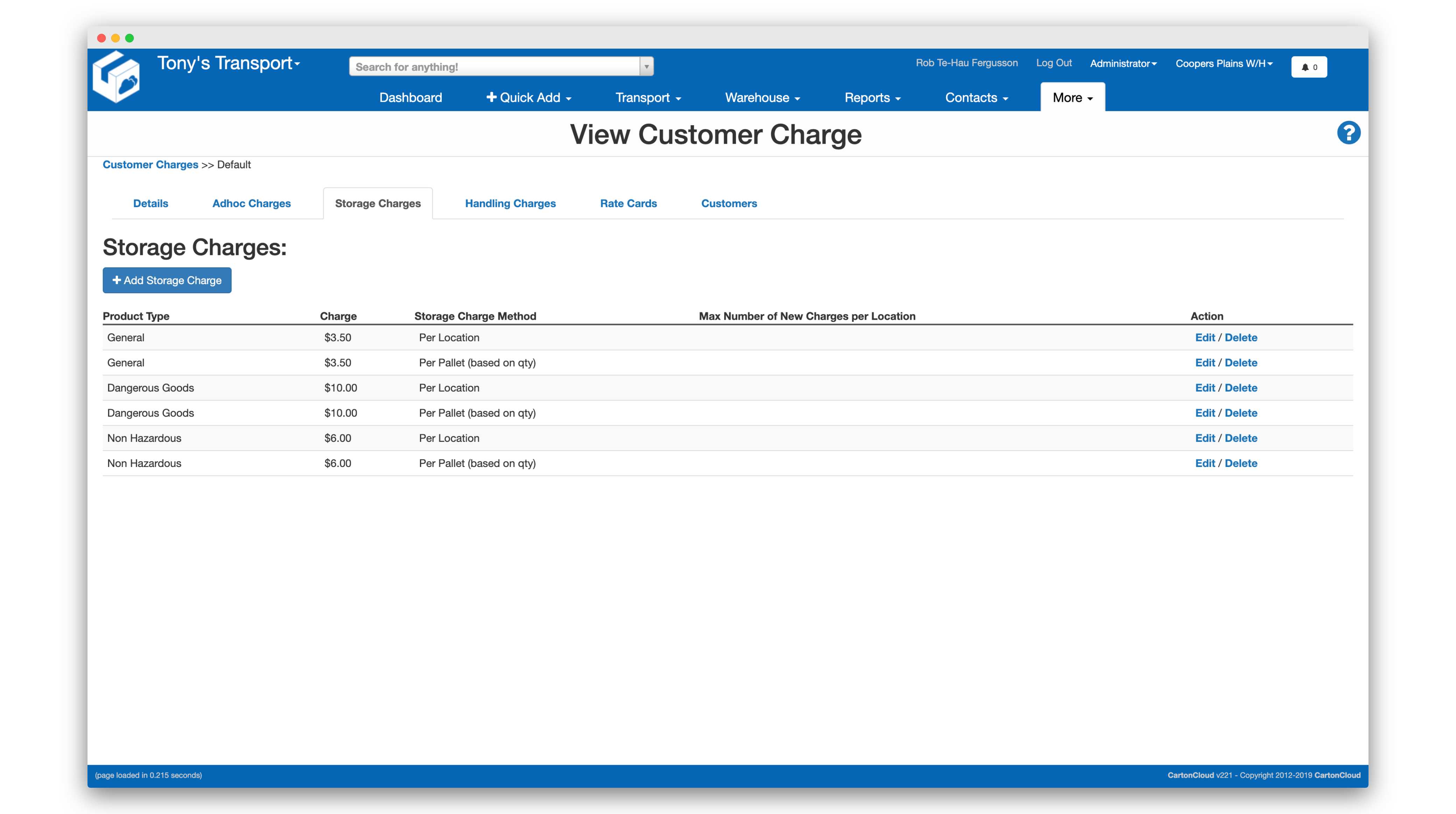 In our warehouse management system our storage charges are charges for storing products inside a warehouse. There are a whole lot of different ways that storage charges can be calculated. Most commonly, the number of pallet spaces that the product consumes is used, but you can also charge storage based on things like weight, volume, or simply how many items there are.
